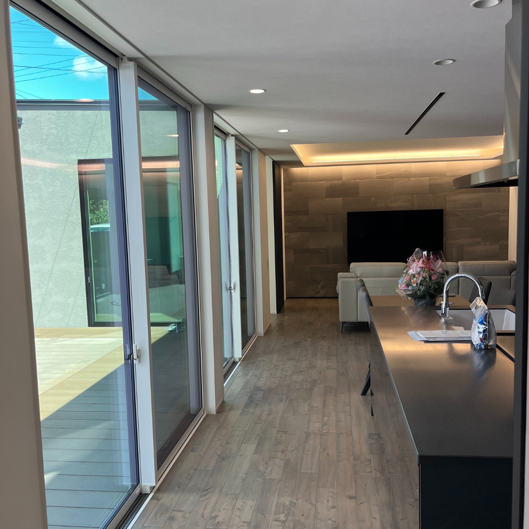 グランドレベルを調整して、しかも掃き出し窓との段差の無い仕様としました。